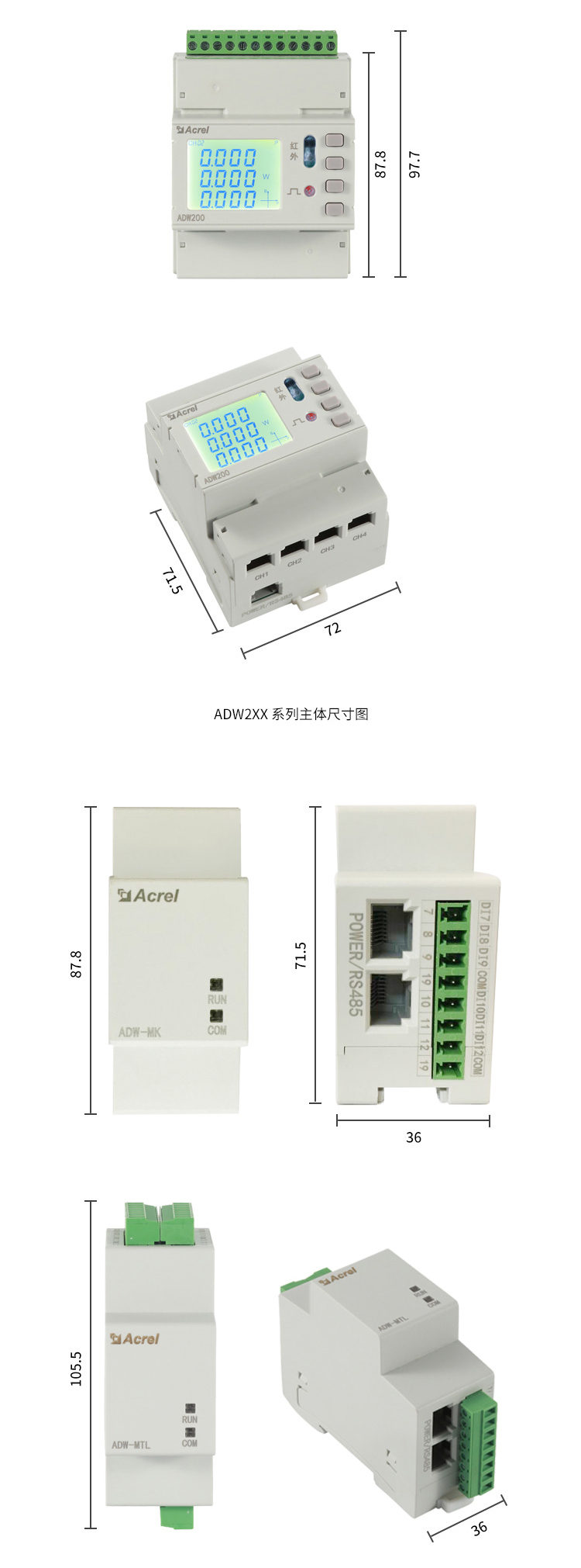 ADW2xx系列導(dǎo)軌式多回路電力儀表方便用戶進(jìn)行用電監(jiān)測(cè)、集抄和管理??伸`活安裝于配電箱內(nèi),實(shí)現(xiàn)對(duì)不同區(qū)域和不同負(fù)荷的分項(xiàng)電能計(jì)量,統(tǒng)計(jì)和分析。