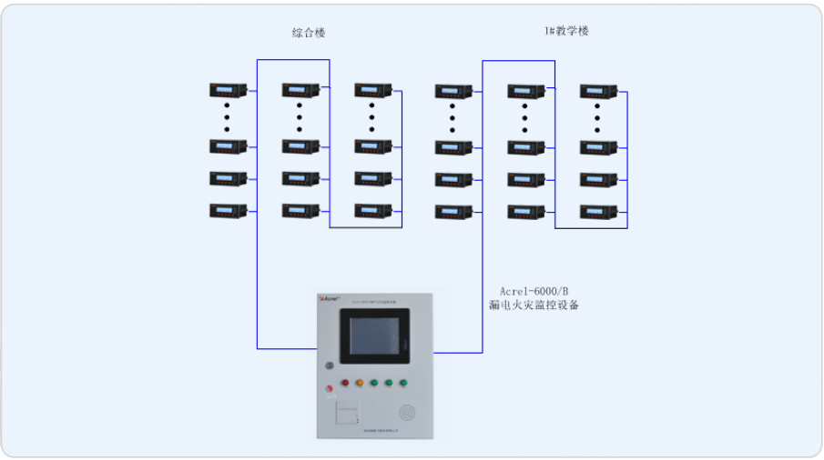 本項目主要是針對上海復(fù)旦高等藝術(shù)實訓(xùn)基地內(nèi)的兩棟教學(xué)樓設(shè)計電氣火災(zāi)監(jiān)控系統(tǒng)。在部分樓層配電柜的重要回路安裝安科瑞研發(fā)的ARCM系列剩余電流式電氣火災(zāi)監(jiān)控探測器,并為其配置一套Acrel-6000/B電氣火災(zāi)監(jiān)控系統(tǒng),電氣火災(zāi)監(jiān)控系統(tǒng)實時監(jiān)測重要回路的剩余電流值、箱體回路的實時溫度,監(jiān)測的數(shù)據(jù)實時傳輸至后臺主機,當(dāng)發(fā)生剩余電流值越限、溫度越限時,后臺能進行聲光報警,同時后臺能夠和消防火災(zāi)報警系統(tǒng)實現(xiàn)消防聯(lián)動。