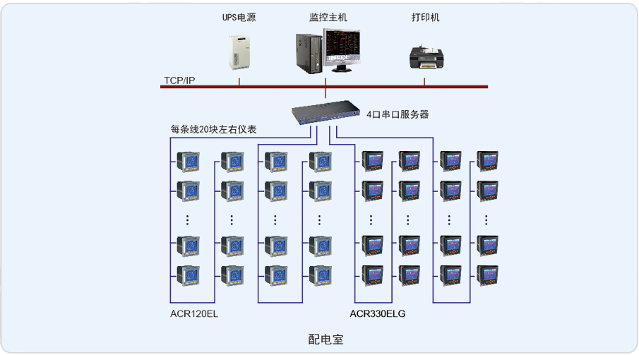 整個系統(tǒng)采用網(wǎng)絡分布式結(jié)構(gòu),監(jiān)控主機位于地下一層變電所值班室內(nèi),配電柜內(nèi)安裝有本公司ACR330ELH、ACR120EL儀表共計60多回路。仁恒河濱花園電力監(jiān)控系統(tǒng)現(xiàn)場共1個低壓配電室,配電室內(nèi)采用安科瑞ACR系列電力監(jiān)控儀表采集各回路的電流、電壓、電能等電參量,然后通過中間層采集設備網(wǎng)線到監(jiān)控室計算機上,實現(xiàn)遙測、遙信功能。