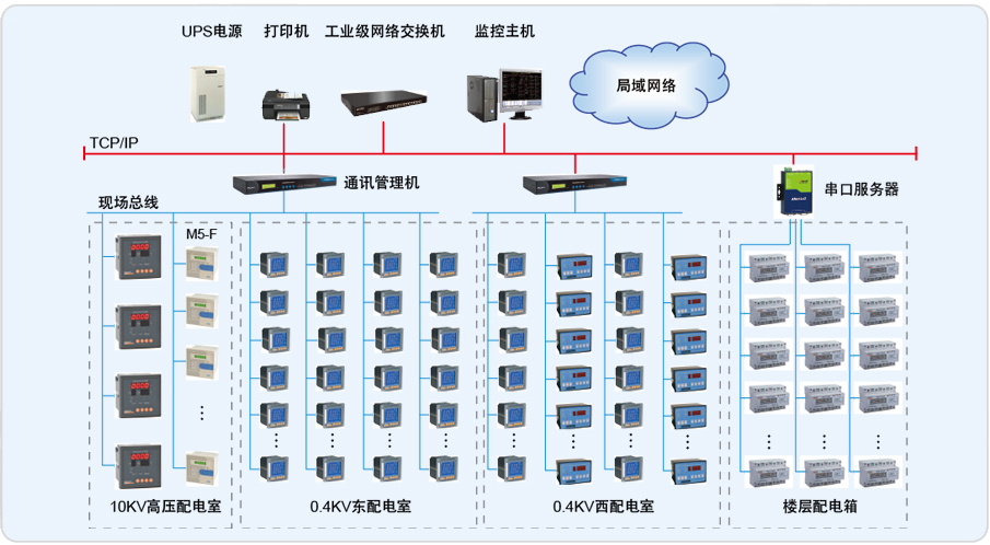 環(huán)智國(guó)際大廈配電系統(tǒng)主要包括:一個(gè)10KV高壓配電室、2個(gè)0.4KV低壓配電室和132個(gè)樓層配電箱。10KV配電間主要包括2路10KV進(jìn)線柜、2個(gè)量電柜、2個(gè)避雷器柜、4個(gè)10/0.4KV變壓器饋線柜。10KV配電間總共使用了8臺(tái)M5-F微機(jī)保護(hù)裝置。0.4KV總進(jìn)線部分選用ACR330ELH網(wǎng)絡(luò)電力儀表,0.4KV的饋線回路選用了ACR220ELF網(wǎng)絡(luò)電力儀表。電力監(jiān)控系統(tǒng)需要通過(guò)T1-T4變壓器溫度控制箱的RS485接口采集變壓器繞組超溫報(bào)警信號(hào)、鐵芯超溫報(bào)警信號(hào)以及傳感器故障信號(hào),并要具有聲音報(bào)警功能。需要采集直流柜的電池充放電狀態(tài)、電池組電壓、電池組電流、電池房溫度等信號(hào),并通過(guò)直流屏信息表在界面上顯示出來(lái)。