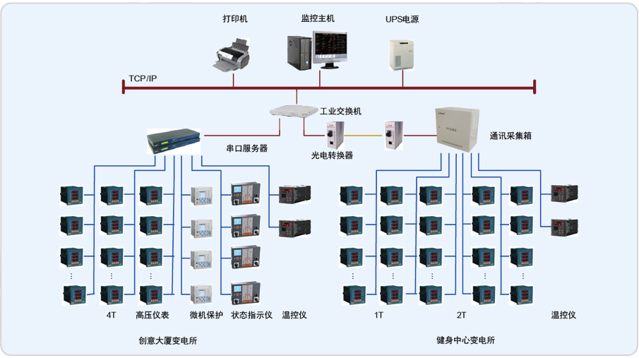 本項目監(jiān)控范圍為健身中心變電所的T1、T2變壓器的低壓進線柜、聯(lián)絡 柜、饋線柜和創(chuàng)意大廈變電所的T3、T4變壓器的低壓進線柜、聯(lián)絡柜、饋線柜及高壓側儀表進行遠程實時監(jiān)控和電能管理直線距離約230米。