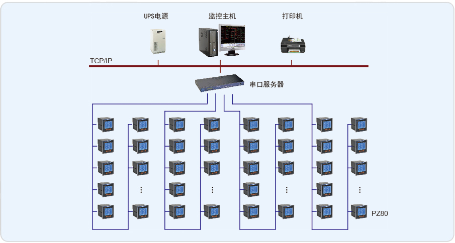本項(xiàng)目共有一個配電室,位于地下二層,本棟大樓所有供電均從該配電室配出。另外,本工程還配備一臺360KW柴油發(fā)電機(jī)組,作為備用電源,當(dāng)市電停電時,從變電所市電開關(guān)輔助接點(diǎn)取發(fā)電機(jī)自啟動信號至發(fā)電機(jī)組,發(fā)電機(jī)組自啟動。在低壓配電,共有2兩路低壓配電進(jìn)線,兩面電容補(bǔ)償柜,一面雙電源切換柜,53路出線回路以及聯(lián)絡(luò)柜。所有回路安裝安科瑞電氣股份有效公司的PZ系列可編程電測表,對本回路用電情況進(jìn)行實(shí)時采集、處理。