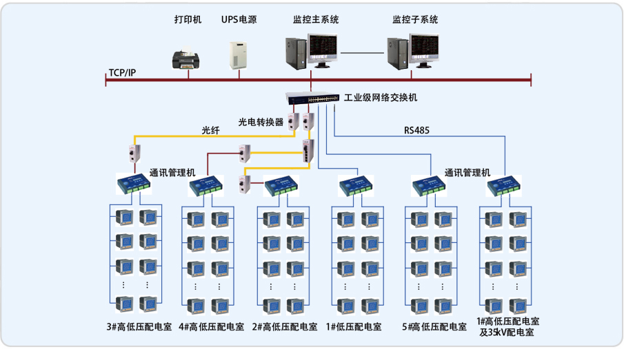 浦江雙輝大廈監(jiān)控部分有1個35kV配電室, 1#、2#、3#、4#、5#5個配電室分10kV高壓和0.4kV低壓。35kV配電室有高壓電力儀表、綜保和2臺變壓器溫控儀,另外5個配電室有10kV高壓電力儀表和綜保,0.4kV低壓部分有電力儀表和22臺變壓器溫控儀。35kV和1#配電室分布在A棟的B2層,2#配電室分布在B棟的B2層,3#配電室分布在A棟的33樓,4#配電室分布在B棟的33樓,5#配電室分布在A棟的B4層。針對浦江雙輝大廈的實際情況,通過計算機和通訊網(wǎng)絡(luò),將分散的配電所的現(xiàn)場設(shè)備連接為一個有機的整體,實現(xiàn)電網(wǎng)設(shè)備運行的遠程監(jiān)控和集中管理。