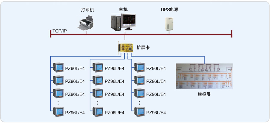 Acrel-2000電力監(jiān)控主要實現(xiàn)北京電氣工程學(xué)校變電所的0.4kV配電系統(tǒng)的用電監(jiān)測與模擬屏的實時監(jiān)控;監(jiān)測范圍為變電所的T1、T2變壓器的低壓進(jìn)線柜、聯(lián)絡(luò)柜、饋線柜中的智能電力儀表和模擬屏,從而實現(xiàn)遠(yuǎn)程實時監(jiān)測和模擬屏的實時監(jiān)控。該系統(tǒng)總計有61只儀表(其中全部為PZ系列智能儀表)和一個模擬屏,分4條總線,由于變電所與值班室距離較近,采用變電所內(nèi)自行組網(wǎng),然后通過擴(kuò)展卡直接接至電腦,實現(xiàn)該現(xiàn)場總線上儀表、模擬屏與監(jiān)控主機(jī)的數(shù)據(jù)連通。