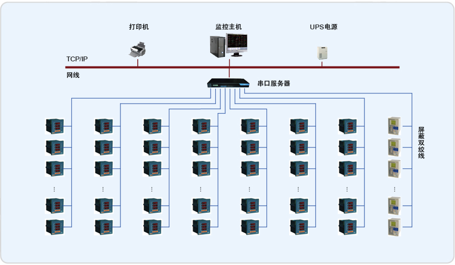 Acrel–2000軟件通過中間采集設(shè)備采集現(xiàn)場電力監(jiān)控儀表數(shù)據(jù),并在系統(tǒng)一次圖顯示出來。主要實現(xiàn)功能如:遠程抄表查,詢各個配電室各個回路按照時間段進行歷史數(shù)據(jù)查詢。趨勢曲線,功率實時趨勢顯示及歷史趨勢查詢功能。系統(tǒng)遙信狀態(tài)報警,根據(jù)本系統(tǒng)的設(shè)計意圖,如果重要回路或者照明回路三相中某一相電流負荷超過額定值的90%,系統(tǒng)必須立刻發(fā)出聲光報警并彈出指示框指明報警源,提醒管理人員注意負載的三相平衡和負載率,同時自動記錄事件發(fā)生的時間和回路名稱,以便用戶查詢,追憶故障原因。