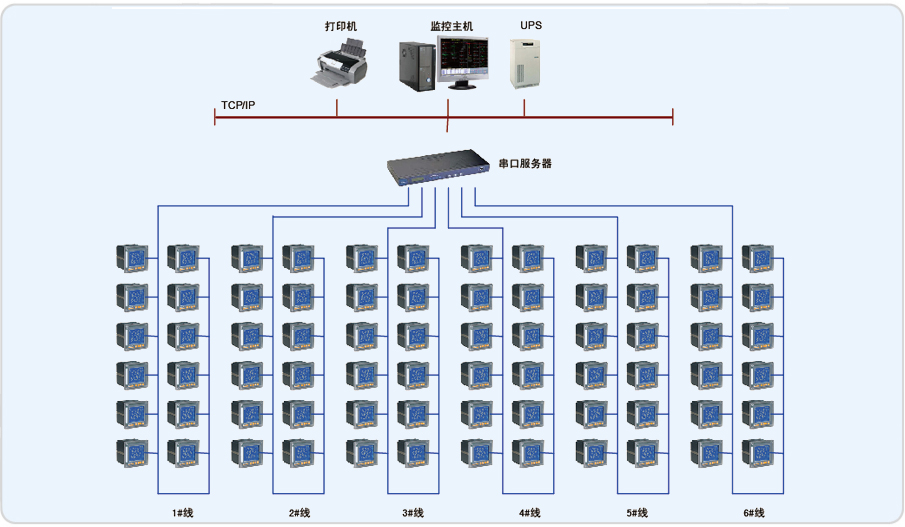 博歐木特種紙業(yè)有限公司三期電力監(jiān)控系統(tǒng)針對(duì)淄博歐木特種紙業(yè)有限公司內(nèi)三期低壓配電室開(kāi)關(guān)柜內(nèi)安裝的安科瑞智能電力儀表,現(xiàn)場(chǎng)約120只儀表,監(jiān)控室位于配電室內(nèi)。為滿(mǎn)足配電室統(tǒng)一監(jiān)控的要求,配電室現(xiàn)場(chǎng)安裝安科瑞公司網(wǎng)絡(luò)電力儀表通過(guò)屏蔽雙絞線(xiàn)手拉手相連至串口服務(wù)器,串口服務(wù)器通過(guò)五類(lèi)線(xiàn)接入后臺(tái)主機(jī),進(jìn)行數(shù)據(jù)傳輸。