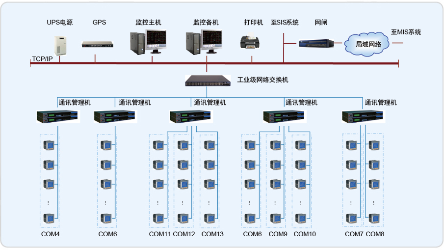 為了能實現(xiàn)對電廠電能量數(shù)據(jù)進行自動采集、遠(yuǎn)傳和存儲、預(yù)處理、線損統(tǒng)計及分析的電能綜合管理平臺,合肥電廠電能量管理系統(tǒng)采用了Acrel-3000電能管理軟件,通過現(xiàn)場總線把現(xiàn)場的電能儀表進行集中管理,做到了自動采集、集中控制、智能管理。同時本電能管理系統(tǒng)還具備同廠內(nèi)SIS(監(jiān)控信息系統(tǒng))以及MIS(管理信息系統(tǒng))共享。