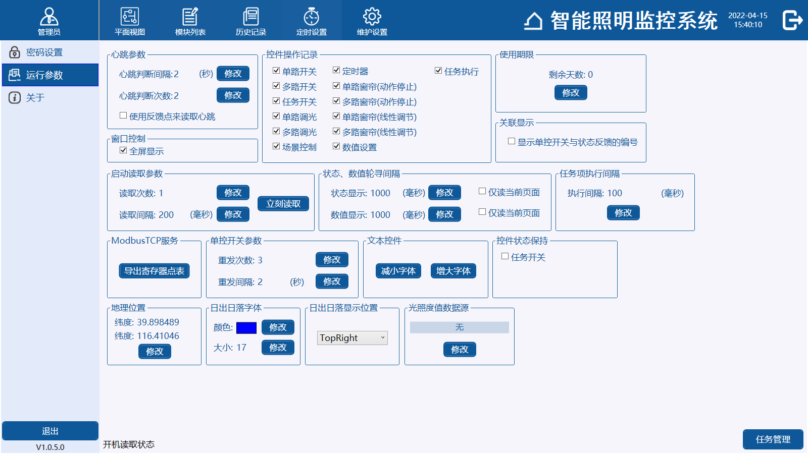 9)系統(tǒng)可以通過(guò)預(yù)設(shè)的當(dāng)?shù)亟?jīng)緯度信息,自動(dòng)計(jì)算每天的日升日落時(shí)間;根據(jù)天文時(shí)鐘控制照明開(kāi)關(guān),實(shí)現(xiàn)日落開(kāi)燈、日出關(guān)燈的功能。