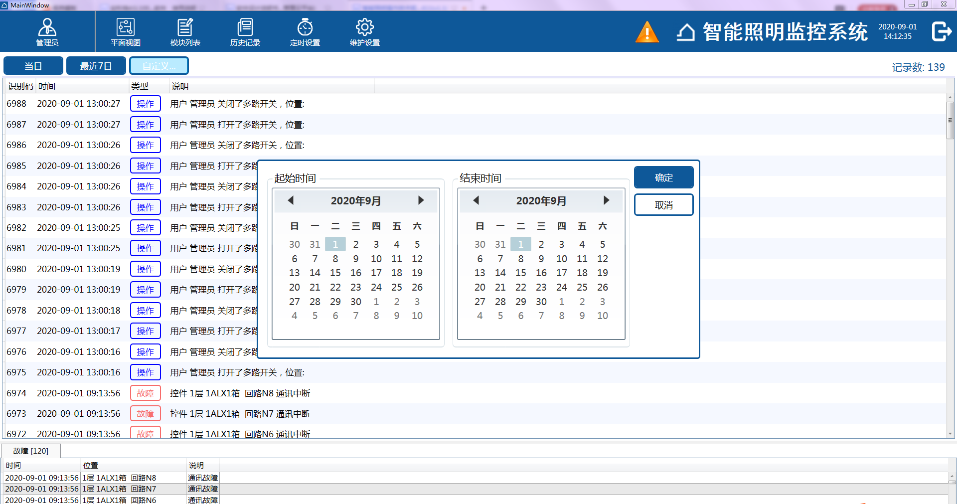 2)當(dāng)發(fā)生模塊離線(xiàn)、網(wǎng)關(guān)設(shè)備掉線(xiàn)或者狀態(tài)反饋和下發(fā)控制命令不一致時(shí)會(huì)發(fā)生故障報(bào)警,并將故障報(bào)警信息記錄并顯示在界面中。