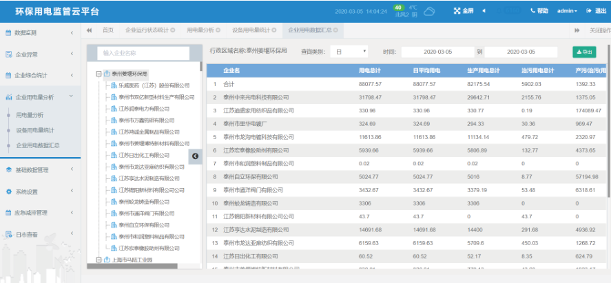 企業(yè)用電數(shù)據(jù)分析:按年/月/日統(tǒng)計企業(yè)以及行政區(qū)域的總用電情況,可導(dǎo)出成報表。