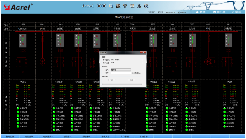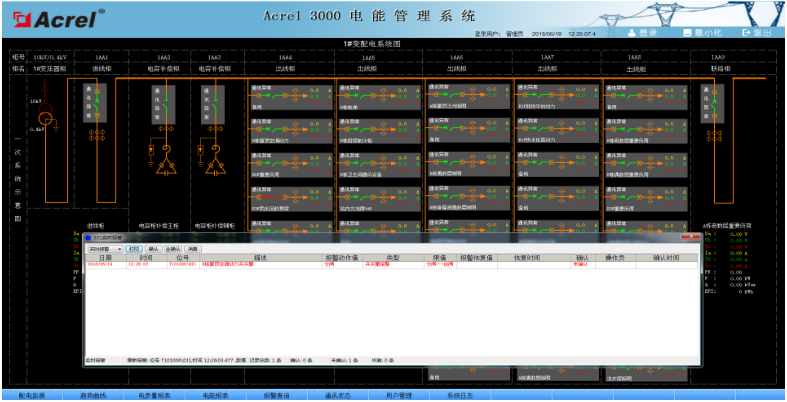 系統(tǒng)人機界面友好,以配電一次圖的形式直觀顯示配電線路的運行狀態(tài),實時監(jiān)測各回路電壓、電流、功率、功率因數(shù)、電能等電參數(shù)信息,動態(tài)監(jiān)視各配電回路斷路器、隔離開關(guān)、地刀等合、分狀態(tài),以及有關(guān)故障、告警等信號。