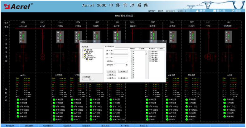 系統(tǒng)為保障系統(tǒng)安全穩(wěn)定運行,設(shè)置了用戶權(quán)限管理功能。通過用戶權(quán)限管理能夠防止未經(jīng)授權(quán)的操作(如配電回路名稱修改等)??梢远x不同級別用戶的登錄名、密碼及操作權(quán)限,為系統(tǒng)運行、維護、管理提供可靠的安全保障。