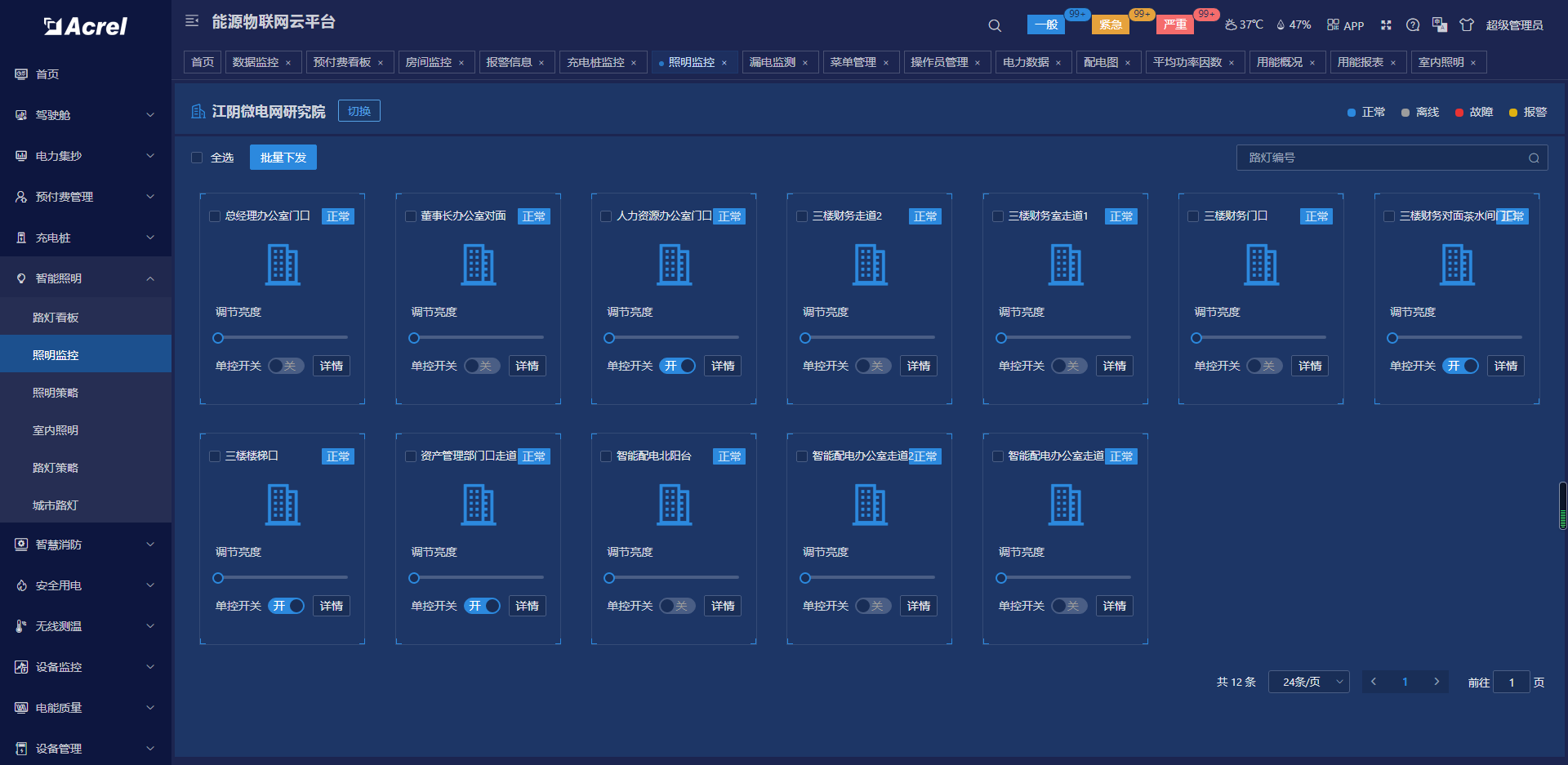 智能照明通過物聯網技術對安裝在城市各區(qū)域的室內照明、城市路燈等照明回路的用電狀態(tài)進行不間斷地數據監(jiān)測,也可以實現定時開關策略配置及后臺遠程管理和移動管理等,降低路燈設施的維護難度和成本,提升管理水平,并達到一定節(jié)能減排的效果。