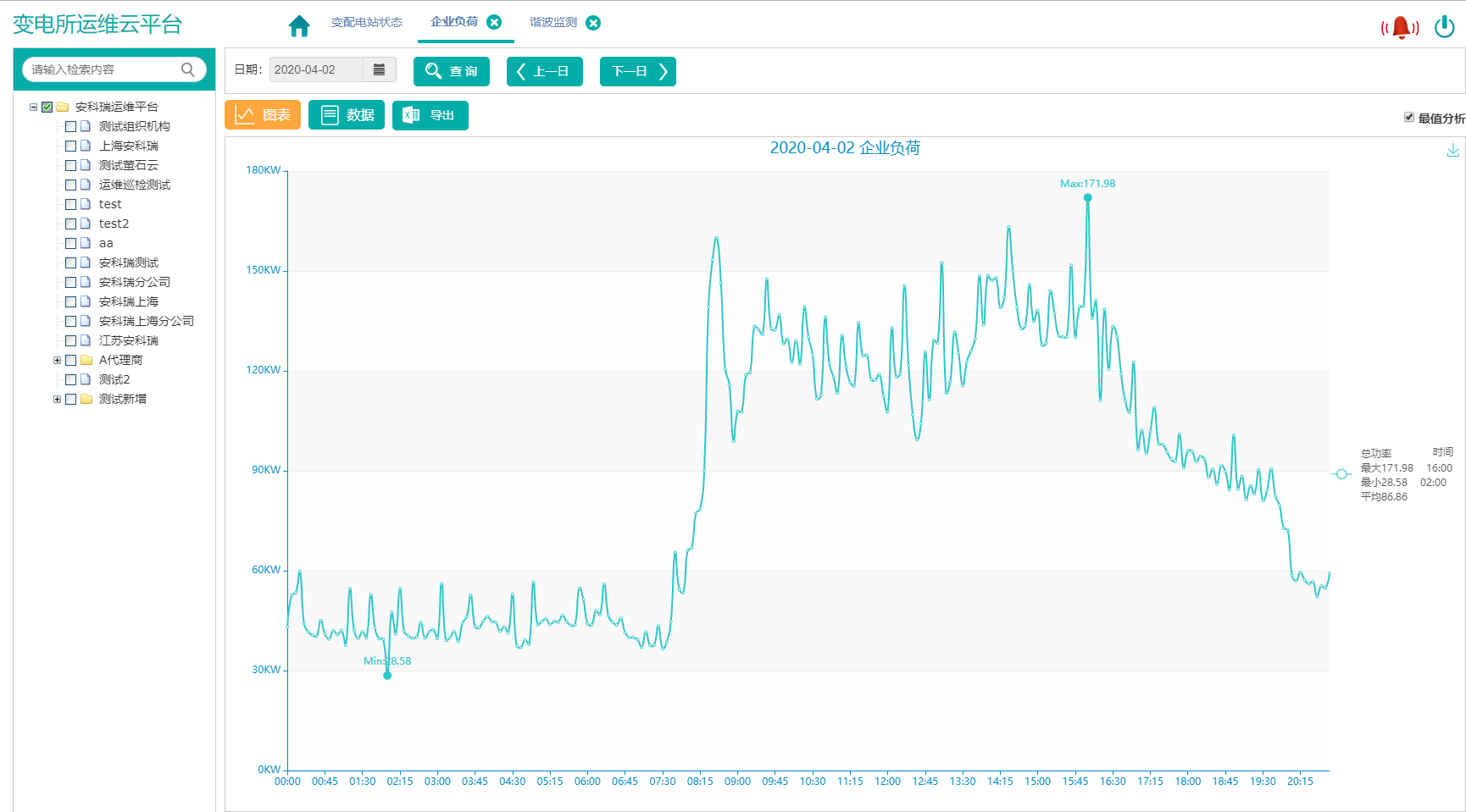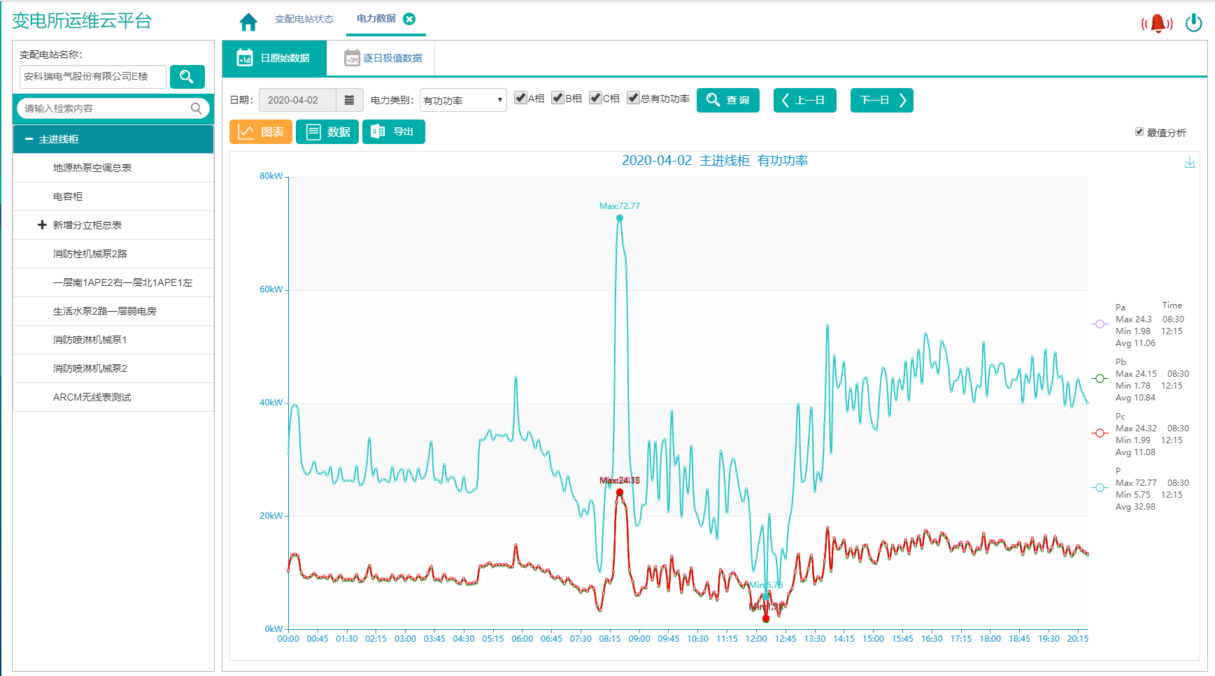 電力數(shù)據(jù)顯示選定變電所選定回路的電力數(shù)據(jù)和曲線,包括電流、相電壓、線電壓、頻率、功率因數(shù)、有功功率、無(wú)功功率、視在功率、電壓、電流不平衡度等參數(shù),曲線顯示統(tǒng)計(jì)期內(nèi)大、小、平均值,并支持導(dǎo)出圖表;方便用戶通過表格查詢數(shù)據(jù)