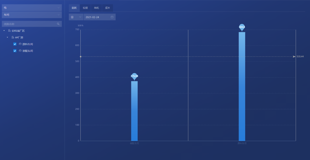 統(tǒng)計各個監(jiān)測節(jié)點(工廠、車間)的當(dāng)年、季度、月、周、日各類能源消耗費用,其中電包括峰電量、峰電費、谷電量、谷電費以及平均電量和平均電費。