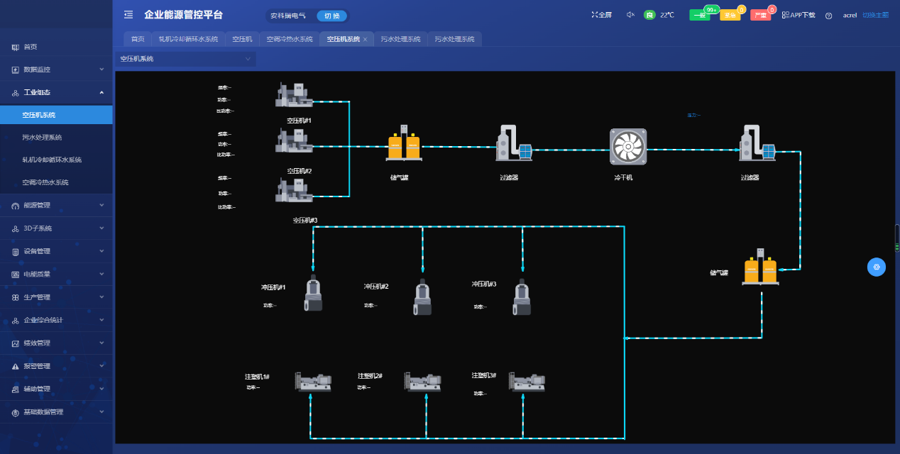 ※ 能源實時監(jiān)控:對于水、電、氣等能源消耗進行實時監(jiān)測,確保用能環(huán)節(jié)的安全持續(xù)穩(wěn)定運行,顯示配電圖、能流圖、能源平衡網(wǎng)絡(luò)圖、能源計量網(wǎng)絡(luò)圖等功能。