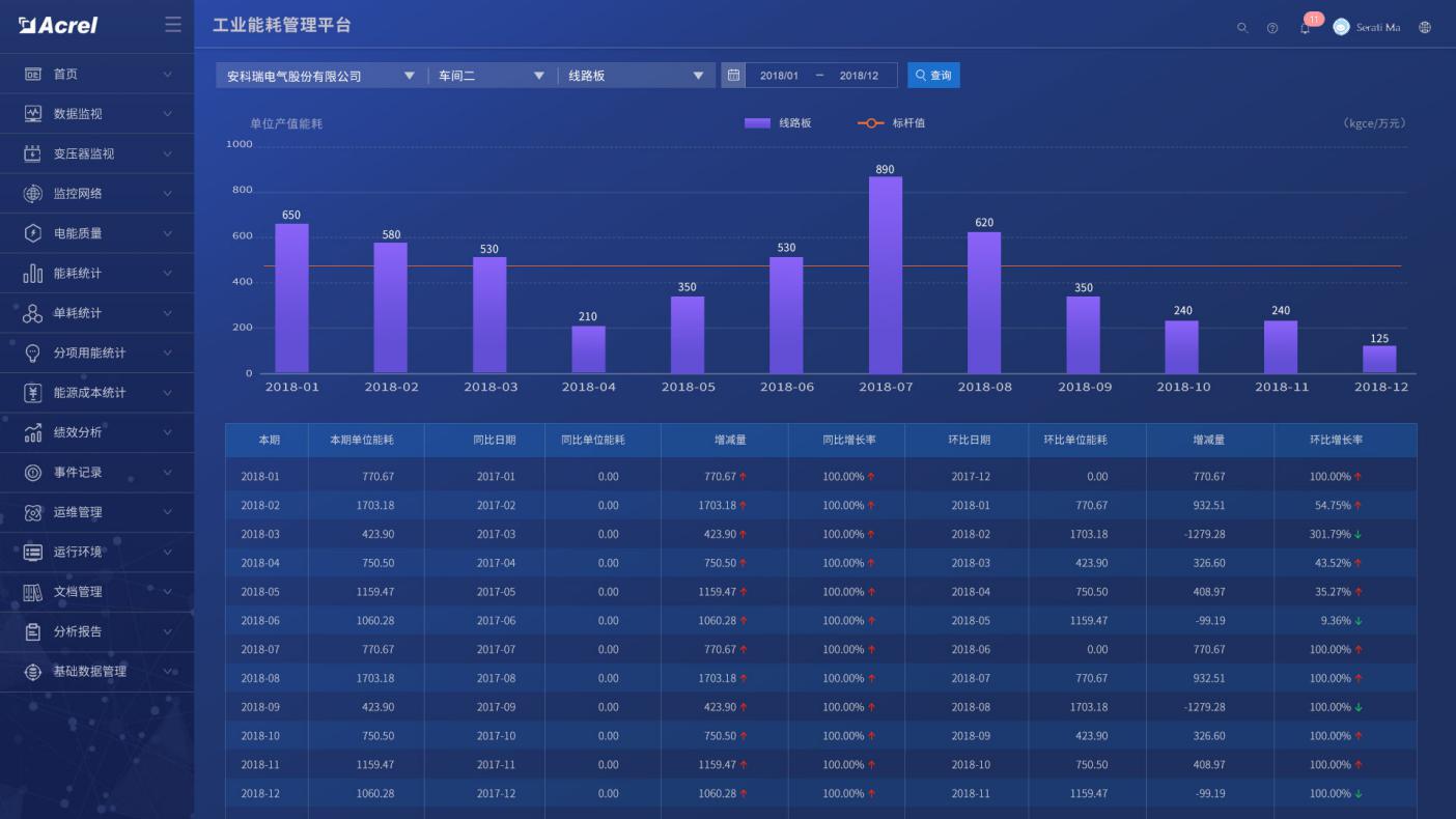 與企業(yè)MES系統(tǒng)對接,通過產(chǎn)品產(chǎn)量以及系統(tǒng)采集的能耗數(shù)據(jù),在產(chǎn)品單耗中生成產(chǎn)品單耗趨勢圖,并進行同比和環(huán)比分析。同時將產(chǎn)品單耗與行業(yè)/國家/國際先進指標對標,以便企業(yè)能夠根據(jù)產(chǎn)品單耗情況來調(diào)整生產(chǎn)工藝,從而降低能耗。