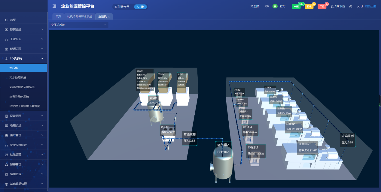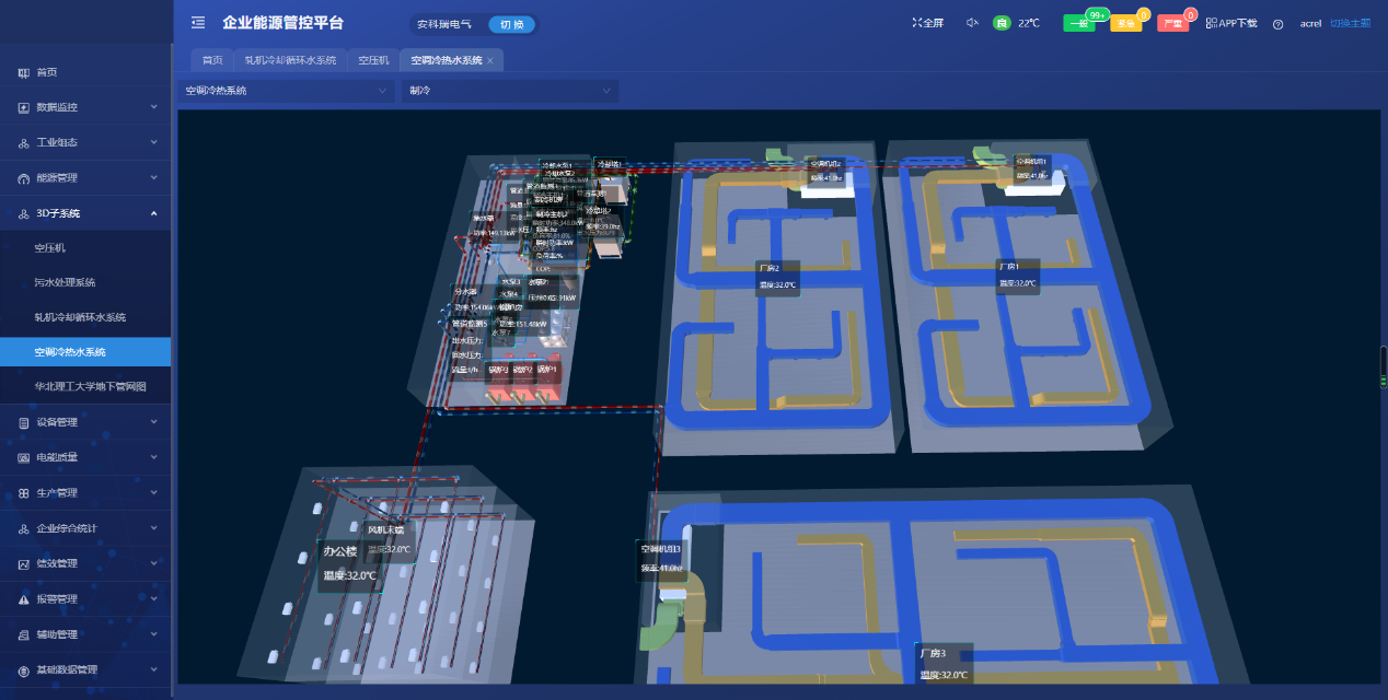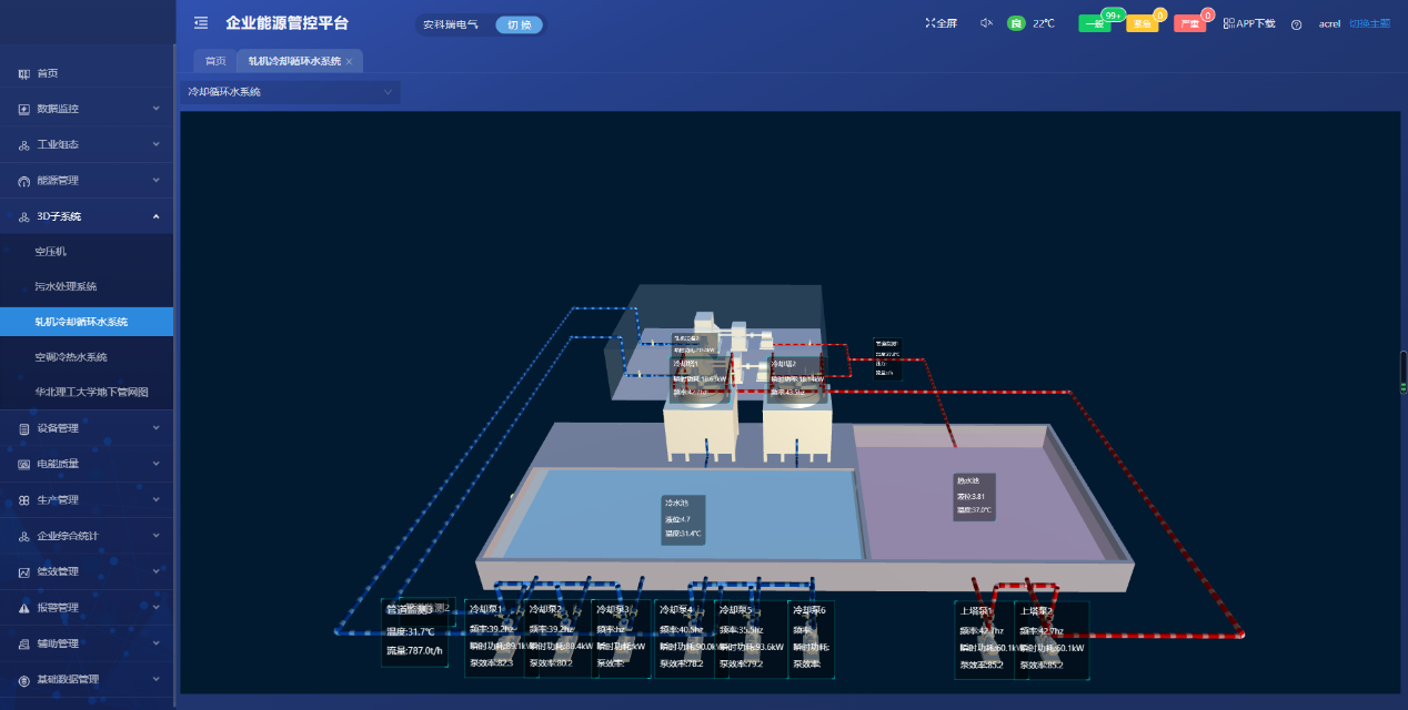 采集廠內(nèi)制冷系統(tǒng)、循環(huán)冷卻水系統(tǒng)、空壓機系統(tǒng)、污水處理系統(tǒng)等運行數(shù)據(jù),可對運行能效數(shù)據(jù)、歷史數(shù)據(jù)、實時數(shù)據(jù)、累計電量、功率、分時段(年、月、周、日)電量及功率進行展示對比分析。