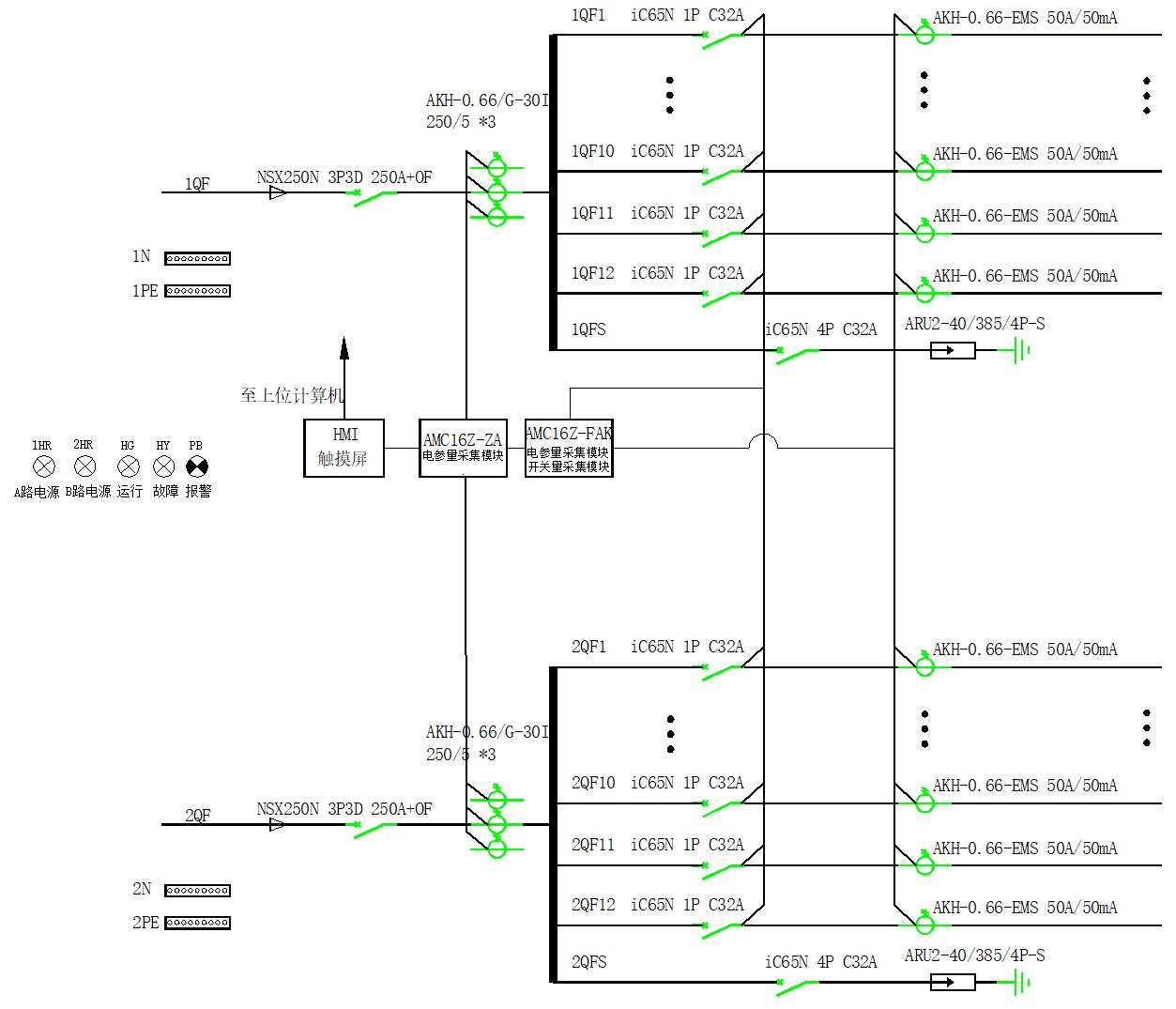 安科瑞交流精密配電監(jiān)控裝置系列是專門針對于數(shù)據(jù)中心服務(wù)器電源管理設(shè)計的測量裝置。該裝置設(shè)計小巧,能夠?qū)?A+B 兩路進(jìn)線和 96或192路出線的全電參量參數(shù)、輸入輸出開關(guān)及防雷器狀態(tài)等實時監(jiān)測, 所有測量通道的告警閾值均可單獨設(shè)定,出線越限事件立即觸發(fā)系統(tǒng)聲光告警,在傳統(tǒng)儀表的體積上實現(xiàn)了監(jiān)控回路的高度集成。如典型配電圖。