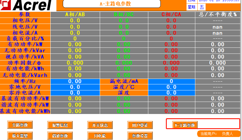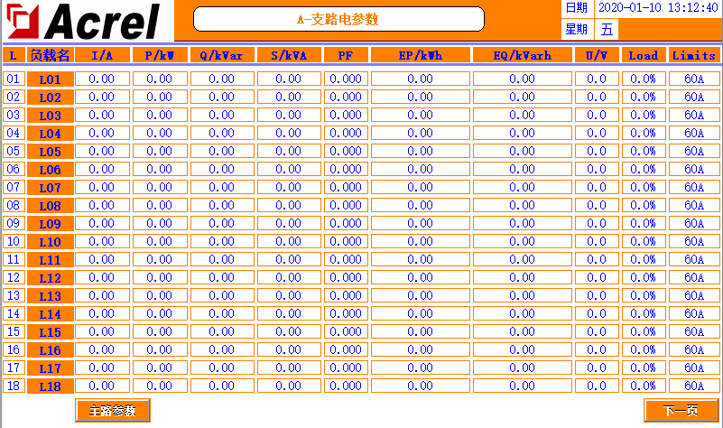 觸摸屏開啟后的第一個界面為主路參數(shù)界面,如果有多路進(jìn)線,可點擊右下角的按鈕切換查看其它進(jìn)線的參數(shù)。