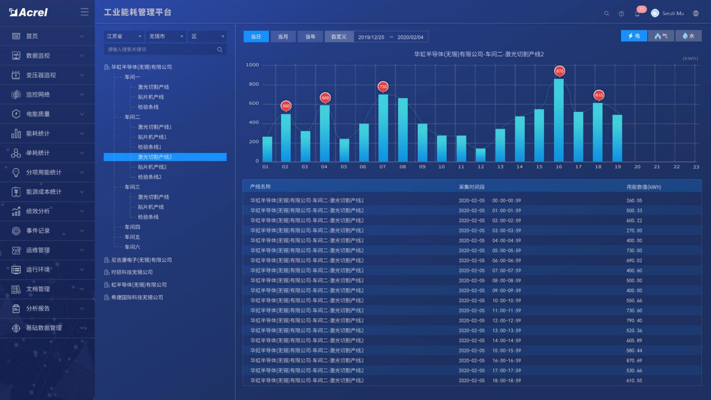系統(tǒng)對(duì)區(qū)域、工段、設(shè)備能源消耗進(jìn)行數(shù)據(jù)采集,監(jiān)測(cè)重點(diǎn)設(shè)備及工藝運(yùn)行狀態(tài),如溫度、濕度、流量、壓力、速度等,并支持變配電系統(tǒng)一次運(yùn)行監(jiān)視??芍苯訌膭?dòng)態(tài)監(jiān)測(cè)平面圖快速瀏覽到所管理的能耗數(shù)據(jù),支持按能源種類(lèi)、車(chē)間、工段、時(shí)間等維度查詢(xún)相關(guān)能源用量。