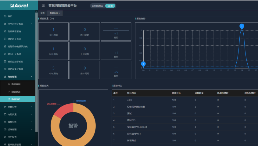 用戶登錄成功之后進入首頁,如圖所示。主要展示的內(nèi)容有:項目概況、設備狀態(tài)、探測器分類、設備報警信息、報警分類、報警統(tǒng)計、設備臺賬信息等。其中百度地圖可以選配成3D建筑模型。